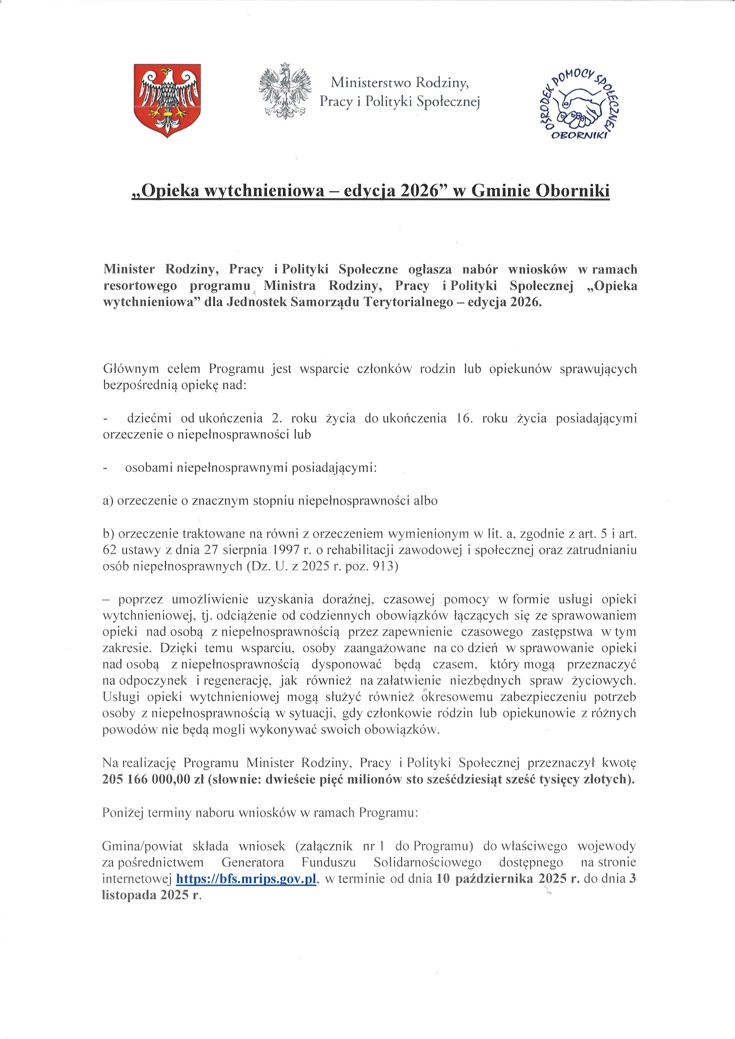 Opieka wytchnieniowa – edycja 2026 w Gminie Oborniki